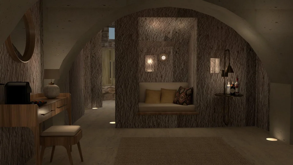 Tarihin derinliklerinde uyumak isteyenler için özenle tasarlanmış benzersiz odamız, antik Kapadokya mimarisinin büyüleyici atmosferini modern konforun zarafetiyle buluşturuyor. Doğal taş dokuların ve geleneksel tasarım öğelerinin uyumlu bir şekilde bir araya geldiği odamız, size zamanda yolculuk hissi yaşatırken tüm modern olanaklarla donatılmıştır.